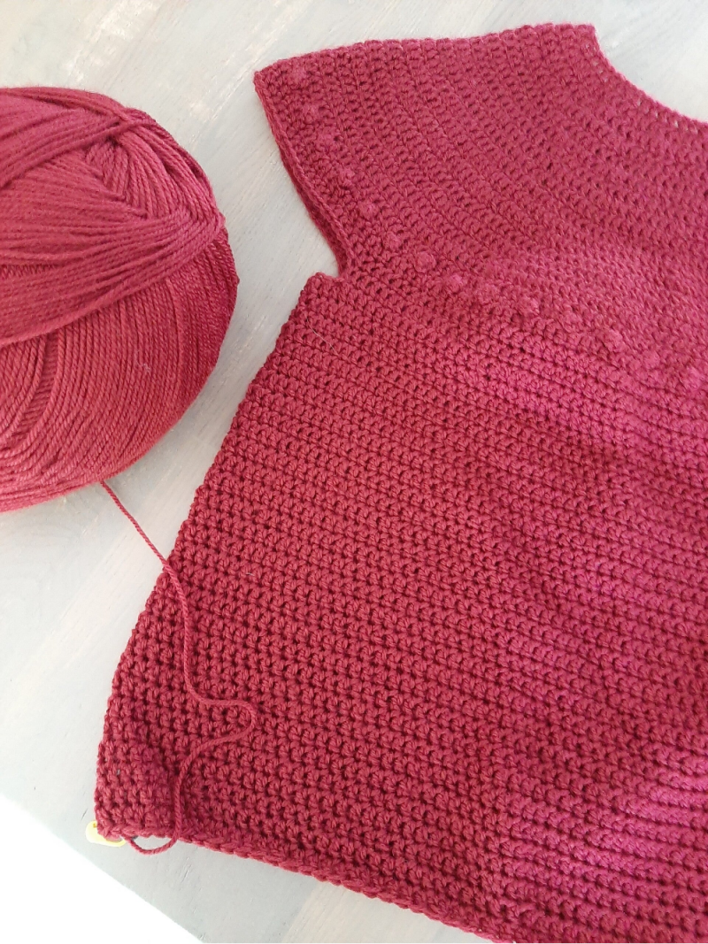 De afgelopen week ben ik een heel eind opgeschoten met mijn nieuwe trui die ik aan het haken ben zonder patroon. Aan de hand van berekeningen maak ik deze trui op mijn eigen maat en ik schrijf elke toer die ik haak op, zodat ik aan het einde een geheel passend patroon heb voor mijn lijf. Daarom maak ik gebruik van de meest simpele haaksteek het stokje. Ik hoop als deze trui past, dat ik daarna echt kan gaan experimenteren met dit model met nieuwe haaksteken. Wel heb ik de popcornsteek leren haken. Wat een mooie steek en helemaal niet moeilijk. Ik vind het echt een toevoeging in je haakwerk. Bijgaand een foto van de trui tot nu toe, in werkelijkheid is de kleur echt wijnrood, veel donkerder dus dan op de foto. Het lijfje is klaar en ik hoef nu alleen de onderzijde af te werken met een haaksteek.