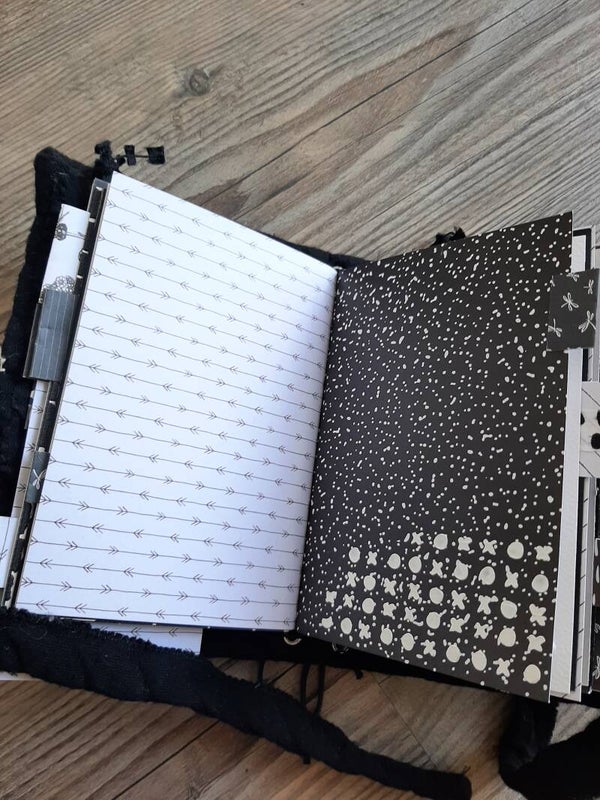 Het gehele journal is handgemaakt. Dit journal is navulbaar met eigen papier. Omdat het uitneembaar is, kun je zelf de volgorde van je pagina’s bepalen en kun je een pagina die je wilt gaan bewerken of schrijven eruit nemen als je dat fijner vindt werken (elastieken). De kaft is van hard karton gemaakt en beplakt met stof. De vierkantjes op de buitenzijde zijn er met de hand opgenaaid. De sluiting is met de machine genaaid. Het journal is 17,5 x 12,5 cm. De vulling bestaat uit 68 pagina’s (met voor- en achterzijde 136 zijdes). De pagina's zijn kleiner dan het journal zelf. Het journal bestaat uit dik en dun papier en is helemaal zwart wit. Het journal bevat vrij veel zwarte pagina’s. Mocht je het journal dus willen beschrijven, denk er dan aan dat je met een witte gelpen of kleurpotlood dient te werken. Als je gaat artjournallen, dan weet je dat je op elke pagina kunt creëren. Het journal bevat 3 tags (boekenleggers) en 2 inserts, waar je dingen in kunt stoppen en een hele hoop tabs en kleine versieringen. Klik op bekijk details voor meer foto's.